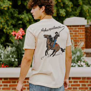 Giddy up! This fun Western inspired tee will surely have any AEPi yelling YeeHaw! On the back of this neutral colored tee is a cowboy showing off his lasso skills by spelling out Alpha Epsilon Pi with a matching front chest. This Western Tee is fraternity favorite!